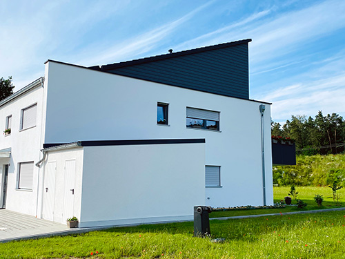 Ein modernes Design trifft auf energieeffieziente Technik sowohl innen wie auch außen. Luftwasserwärmepumpe zur sparsamen Beheizung mittels Niedrigtemperaturtechnik kombiniert mit besten Dämmmaterialien begründen den niedrigen Energieverbrauch der Häuser.
