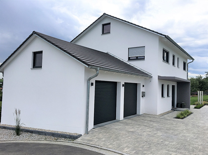 Extrahohe angerenzende Garage mit verstärkter Bodenplatte und Estrich sowie elektrischer Rollmatic Garagentoren ermöglichen dem Bauherren sein Autohobby nun auch bequem zuhause auszuführen und bietet darüberhinaus viel Platz für eine Werkbank und zusätzlichen Stauraum.